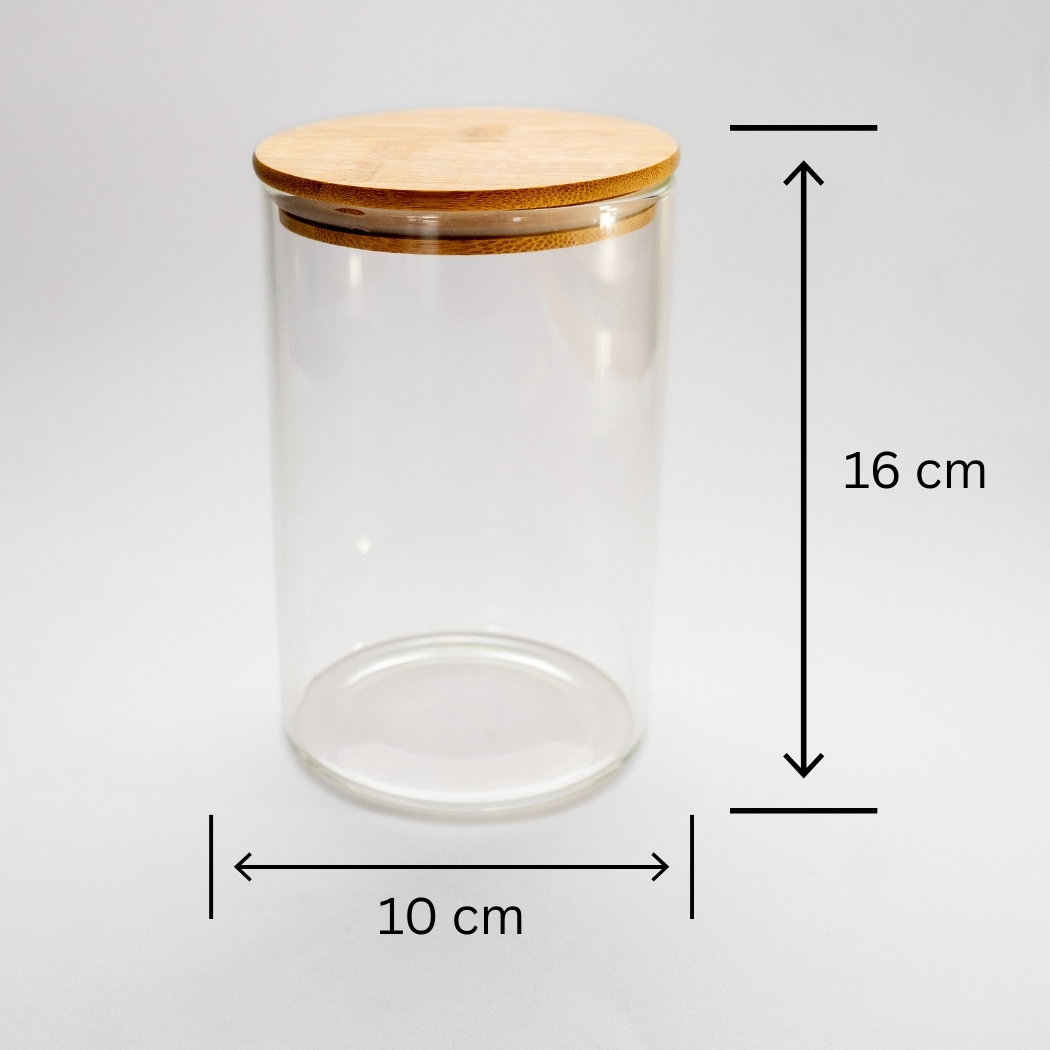 - Set of 2 borosilicate glass jars with airtight wooden lids.